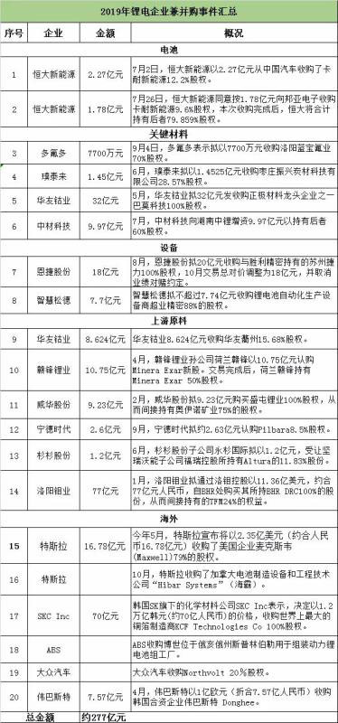 然而隨著新能源汽車補(bǔ)貼腰斬,2019年動(dòng)力電池行業(yè)漸漸入冬,資本回歸謹(jǐn)慎理性,鋰電行業(yè)兼并購(gòu)動(dòng)作明顯放緩。
