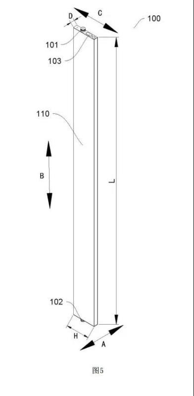 具體來(lái)看,比亞迪正在研發(fā)一種長(zhǎng)度L>600mm的電芯;所述電池本體的長(zhǎng)度L與寬度H滿足:L/H=4——21。作為一些實(shí)施例,電池本體110的長(zhǎng)度L為600mm——1500mm,最長(zhǎng)可到2500mm。