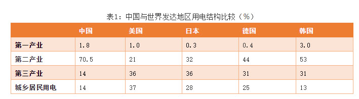 發(fā)達國家的電力消費結(jié)構(gòu)基本呈現(xiàn)第二產(chǎn)業(yè)用電、第三產(chǎn)業(yè)用電和居民用電相對均衡的特征。目前隨著我國電力需求增長的逐步轉(zhuǎn)變,電力消費結(jié)構(gòu)朝著均衡方向發(fā)展,第三產(chǎn)業(yè)和居民用電比重將逐步提高,相應的第二產(chǎn)業(yè)用電比重逐步下降,但短期內(nèi)下降到50%以下的可能性較低,未來電力消費結(jié)構(gòu)可能更接近于同為制造業(yè)強國的德國和制造業(yè)較強的韓國的用電結(jié)構(gòu)。
