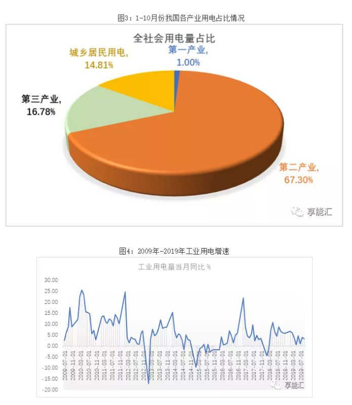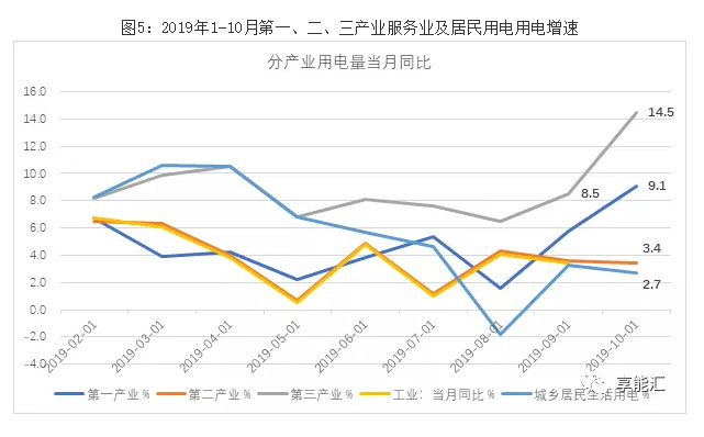 經(jīng)歷了2018年全社會用電量8.4%的高速增長后,由于經(jīng)濟下行壓力以及2018年的高基數(shù)影響,2019年增速出現(xiàn)下滑。2019年1-10月,全社會累計用電量59232億千瓦時,同比增長4.4%,增速比上年同期下降4.3個百分點。2019年10月份,全國全社會用電量5790億千瓦時,同比增長5.0%,增速比上年同期下降2.3個百分點。雖然用電量增速出現(xiàn)下滑,但用電結(jié)構(gòu)正在悄然變化。