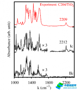 他們進一步研究了不含金屬的純有機分子在TiO2界面上的原子結(jié)構(gòu)對形成的有機染料太陽能電池效率的影響。這類分子一般采納Donor-π-Acceptor的結(jié)構(gòu),大多通過氰基丙烯(cyanoacrylic) 基團與表面結(jié)合。雖然這一類分子得到極為廣泛的應(yīng)用,但其吸附結(jié)構(gòu)并不清楚。此前人們普遍認為這一類有機染料與傳統(tǒng)釕復(fù)合物染料類似,只通過羧基吸附在TiO2表面?;诘谝恍栽矸肿觿恿W(xué)和含時密度泛函理論計算,焦揚等與瑞士聯(lián)邦理工Michael Graetzel教授合作研究了含氰基丙烯基團的有機分子在銳鈦礦TiO2(101)表面的吸附和電子動力學(xué)(圖1)。通過對動力學(xué)模擬得到的振動譜的詳細分析和與實驗得到的紅外吸收譜的比較(圖2),他們發(fā)現(xiàn)氰基和羧基共同參與表面吸附,該吸附構(gòu)型非常有利于太陽能源轉(zhuǎn)化。