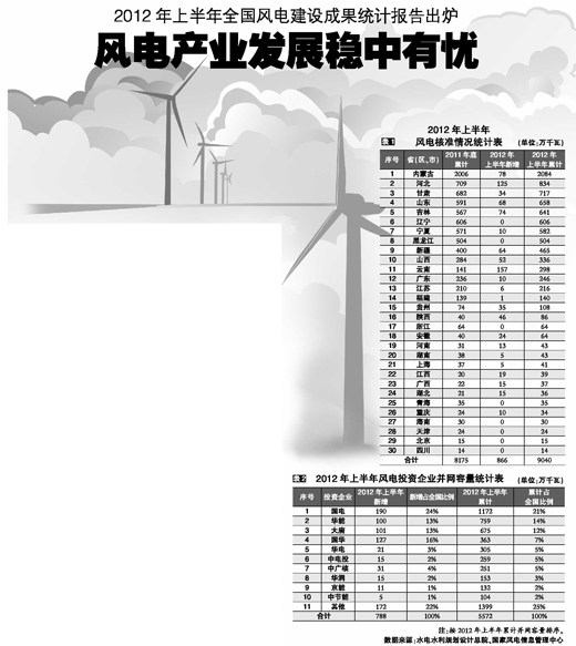 中國儲能網(wǎng)訊:日前,由水電水利規(guī)劃設(shè)計(jì)總院、國家風(fēng)電信息管理中心完成的《2012年上半年全國風(fēng)電建設(shè)成果統(tǒng)計(jì)報(bào)告》出爐。報(bào)告顯示,今年上半年,我國風(fēng)電產(chǎn)業(yè)延續(xù)了平穩(wěn)增長的勢頭,但暴露出的一些問題也不容忽視。