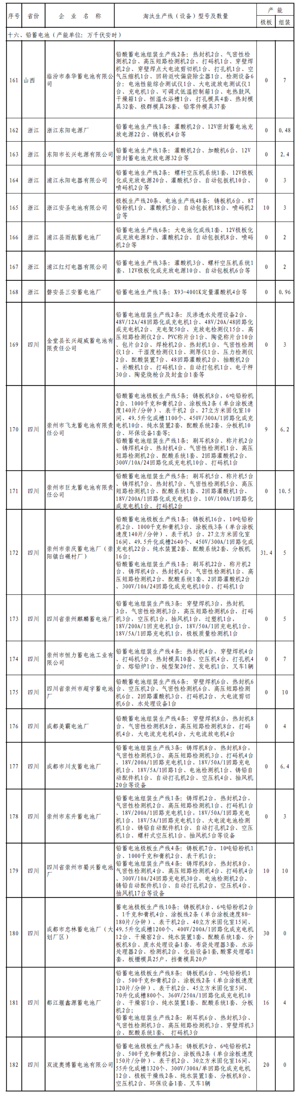 其中包括極板126.4萬千伏安時、組裝94.94萬千伏安時。涉及鉛蓄電池落后產(chǎn)能企業(yè)共計22家,浙江和四川居多,其中四川省獨攬14家,浙江企業(yè)7家,山西1家。