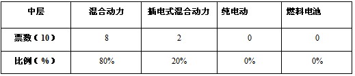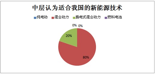 圖表2、3、4、5數(shù)據(jù)顯示,高層和中層認為混合動力是目前的主推方向,而技術(shù)專家則認為在混合動力將作為過渡階段,在國家政策的支持下,看好插電式混合動力的發(fā)展。