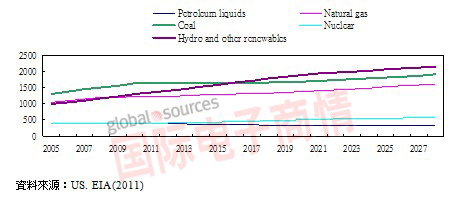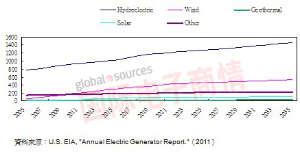 依據(jù)美國能源信息部(Energy Information Administration,EIA)再生能源包含水力發(fā)電及其它風力、太陽能發(fā)電將維持年復合成長率2.7%至2035年,成長率高于其它發(fā)電電源,如圖二。