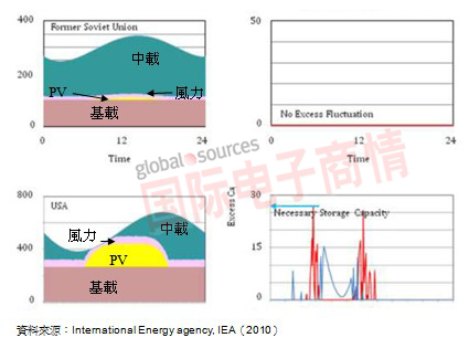 以各國電力分布來看電網(wǎng)儲能需求,前蘇聯(lián)(FormerSovietunion ,FSU)因至2050年的再生能源包含風力及太陽能在能源的占比很低,見圖五,所以無電網(wǎng)儲能的需求。其它再生能源發(fā)展國家,以美國為例,其電力組合基載、風力及PV發(fā)電的供給總和在某些時段可能會超過需求,在此情況下,電網(wǎng)儲能可有效的儲存電網(wǎng)剩余電力。