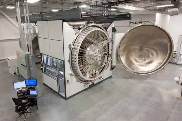 加快太陽能發(fā)電:雙溪公司的海曝離3(Hyperion 3)是離子加速器,用氫離子轟擊硅板,產(chǎn)生非常薄的太陽能硅片,用于太陽能電池。硅板排列在所說結(jié)構(gòu)的外圍,離子撞擊晶圓時,這些結(jié)構(gòu)會旋轉(zhuǎn)。來源:麻省理工科技創(chuàng)業(yè)