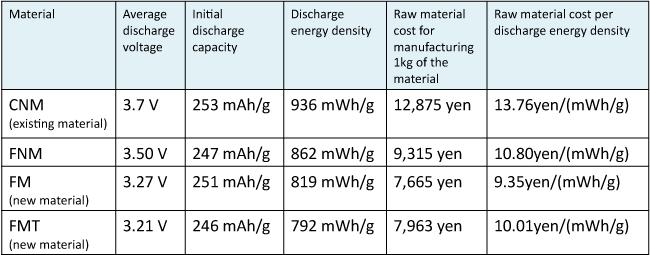 表1:現(xiàn)有正極材料和以前開發(fā)的正極材料,比較最初的充放電特性以及新開發(fā)的正極材料成本。來源:日本先進(jìn)工業(yè)科學(xué)和技術(shù)研究所