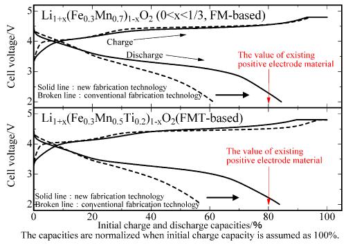 圖1:比較最初的充電和放電特點(diǎn),兩種新開發(fā)的正極材料(金屬鋰用作負(fù)極材料;電壓范圍:2.0 V至4.8伏)。來源:日本先進(jìn)工業(yè)科學(xué)和技術(shù)研究所