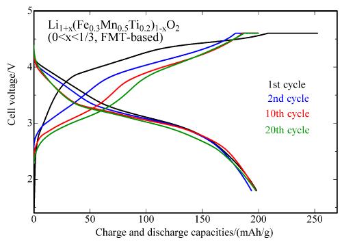 圖3:充電和放電周期特性,新開發(fā)的基于鐵錳鈦的正極材料在30攝氏度可達(dá)到20個(gè)循環(huán)(碳被用作負(fù)極材料,電位范圍:1.8 V至4.6 V)。來源:日本先進(jìn)工業(yè)科學(xué)和技術(shù)研究所