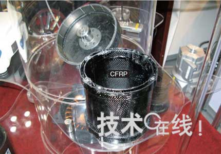 | 圖1:實現了輕量化的馬達機殼(Takanayagi) 材料采用CFRP,使用木模成型。重量只有鋁合金機殼的1/5。 |