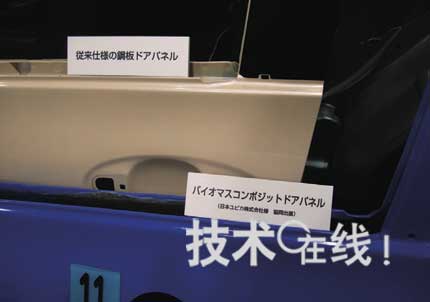 日本杰斯比(JSP)和優(yōu)必佳(U-PICA)展出了采用經過玻璃纖維強化處理的植物性樹脂(植物性FRP)和植物性發(fā)泡芯材相結合的“復合板”制成的汽車車門板(圖2)。包含玻璃窗在內,這種復合板車門約重21kg,比約28kg的鋼板車門輕7kg。還有望提高隔熱性、吸音性及沖擊吸收性等性能。
