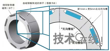轉子為8極,轉子上插入了8個這種磁鐵。如果第1極沒有溝槽,則第3、5、7極也沒有溝槽,而在第2、4、6、8極設有溝槽。具體而言,就是在轉子外周上正好相當于磁鐵兩端附近之處,加工深1mm×寬5mm左右的小溝槽。因此,各個“有溝槽極”上分別設有兩個溝槽。