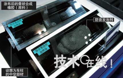 | 圖4:涂布型防音發(fā)泡劑“Penguin Form”(盛勢達技研) 將含有發(fā)泡劑的膏狀合成橡膠填入車柱中,通過加熱使其發(fā)泡。這樣,車輛行駛時的風切音等噪音就不易傳入車內。照片遠處為發(fā)泡前的狀態(tài),近處為發(fā)泡后的狀態(tài)。 |