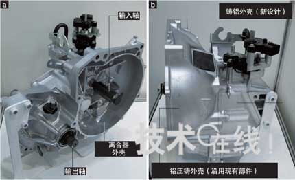 | 圖8:驅動用馬達減速機(富士機械) 已配備于斯巴魯Plugin Stella。屬于兩檔減速型,輸入軸與馬達軸連接。內部有中間軸(照片上看不到),輸出軸與車輪端相連(a)。鋁壓鑄離合器殼體沿用了現有部件。殼體蓋為新制造,由模具費用比鋁壓鑄品低的鋁鑄造品制成(b)。 |
