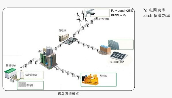 孤島系統(tǒng)模式是BESS與一個或多個發(fā)電系統(tǒng)并聯(lián)形成一個局部的“微網(wǎng)”。孤島系統(tǒng)的主要特征是局部電網(wǎng)與大電網(wǎng)脫離,BESS的額定功率與局部電網(wǎng)產(chǎn)生的總功率大致相等。在這個系統(tǒng)中,BESS必須可以充當(dāng)網(wǎng)路電源,給“微網(wǎng)”提供電壓和頻率控制。