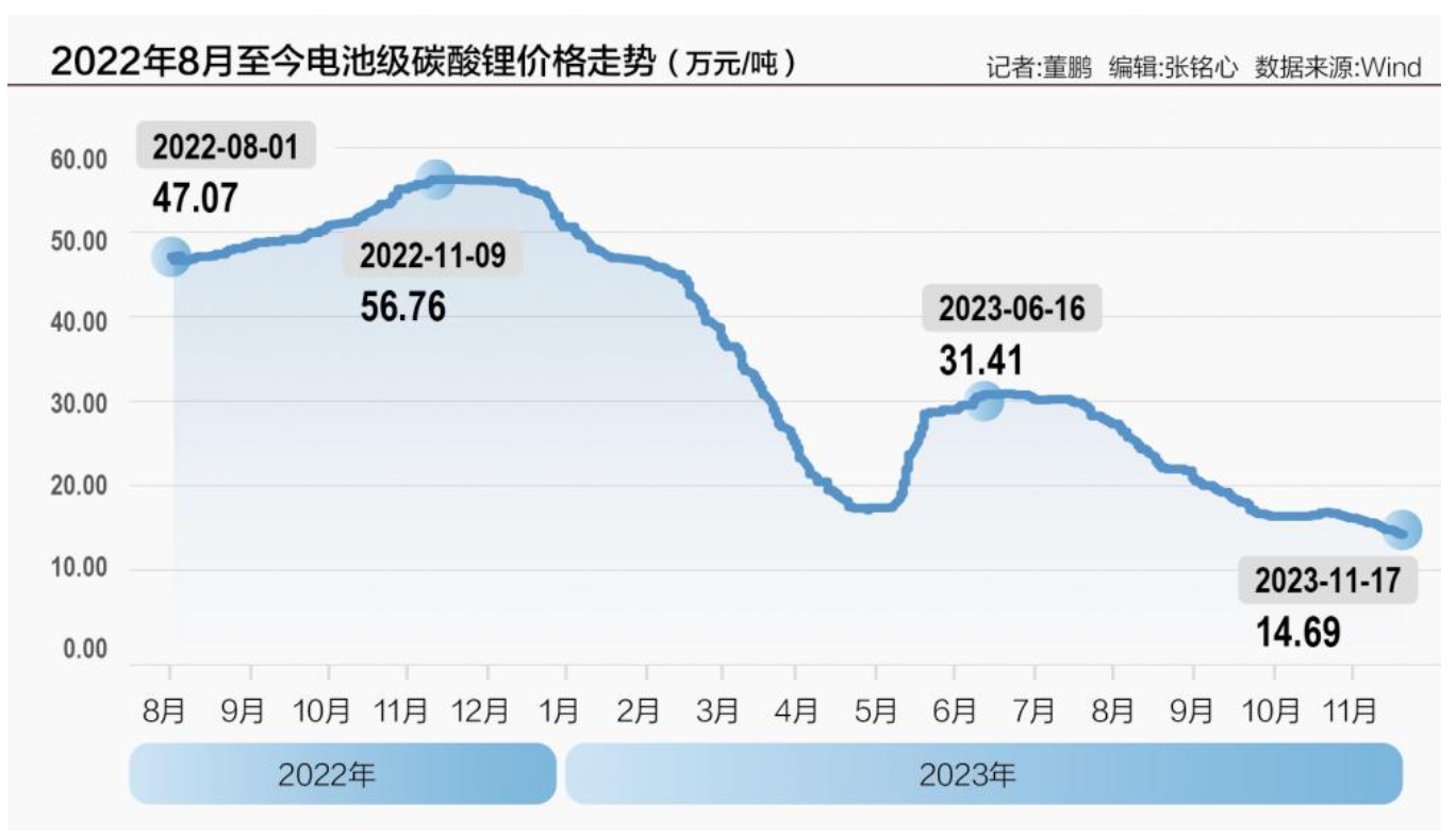 碳酸鋰期貨剛好趕上下跌周期,所以在上市初期下跌的“十分順暢”,2401合約也從24.6萬元的掛牌基準(zhǔn)價(jià)一路跌破15萬元。