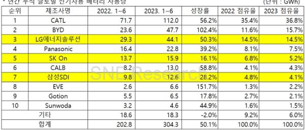 相較而言,2023年1—6月韓國(guó)三家公司LG新能源、三星SDI和SK on 市場(chǎng)占有率23.9%,比去年同期下降了2.2個(gè)百分點(diǎn),但三家公司的電池裝車(chē)量均呈現(xiàn)增長(zhǎng)趨勢(shì)。LG能源44.1GWH與去年同期相比增長(zhǎng)50.3%,排在第三位,SK on裝車(chē)15.9GWH,同比增長(zhǎng)16.1%,三星SDI裝車(chē)12.6GWH,同比增長(zhǎng)28.2%,分別排在第五位和第七位。