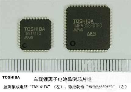 該芯片組由監(jiān)控集成電路(IC)“TB9141FG”、設備控制高密度集成電路(LSI)的微控制器“TMPM358FDTFG”構(gòu)成。1個監(jiān)控集成電路TB9141FG可監(jiān)控16個鋰離子電池單元,規(guī)模為業(yè)界最大。通過使用該電路,電池的部件個數(shù)得以減少,能夠降低系統(tǒng)構(gòu)成的成本。