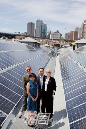 2010年11月26日,澳大利亞悉尼,施正榮和夫人張唯與好萊塢明星凱特·布蘭切特和丈夫安德魯·阿普頓站立于悉尼劇院屋頂,慶祝384千瓦尚德光伏系統(tǒng)順利并網(wǎng)。