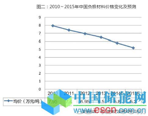 石墨類負(fù)極材料的價(jià)格近幾年呈現(xiàn)持續(xù)下降的趨勢,而且預(yù)計(jì)未來幾年這一趨勢仍將維持。預(yù)計(jì)未來3年負(fù)極材料均價(jià)會(huì)維持5%~10%的年均跌幅(圖二)。價(jià)格逐年下降,負(fù)極材料的毛利率隨之下滑,2013年國內(nèi)負(fù)極材料的毛利率在15~20%之間。