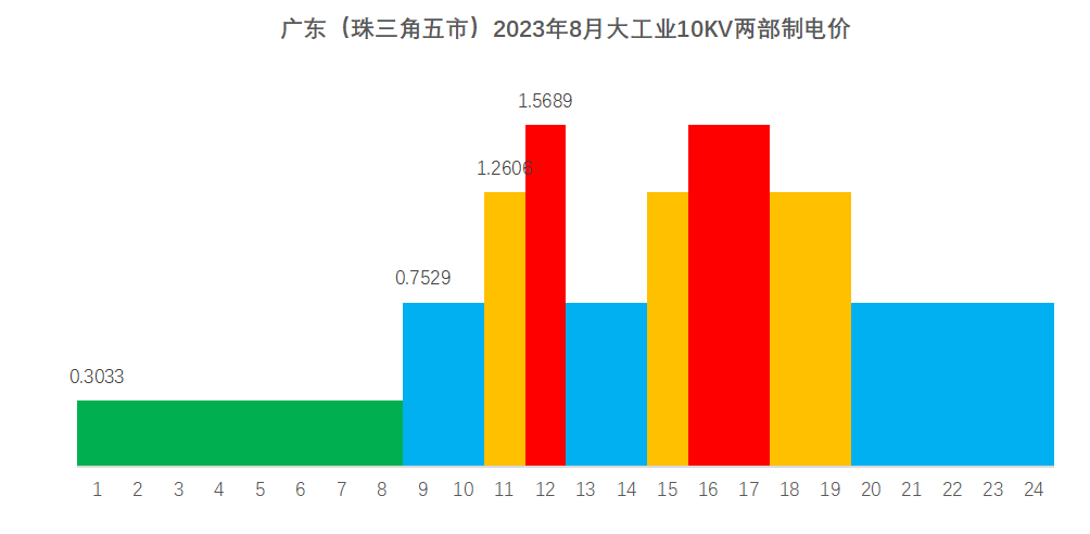 廣東省現(xiàn)行的峰平谷比價為1.7:1:0.38,尖峰電價執(zhí)行時間為7月、8月和9月三個整月,尖峰電價在峰段電價基礎(chǔ)上上浮25%。2023年8月廣東(珠三角五市)10KV兩部制分時電價如下: