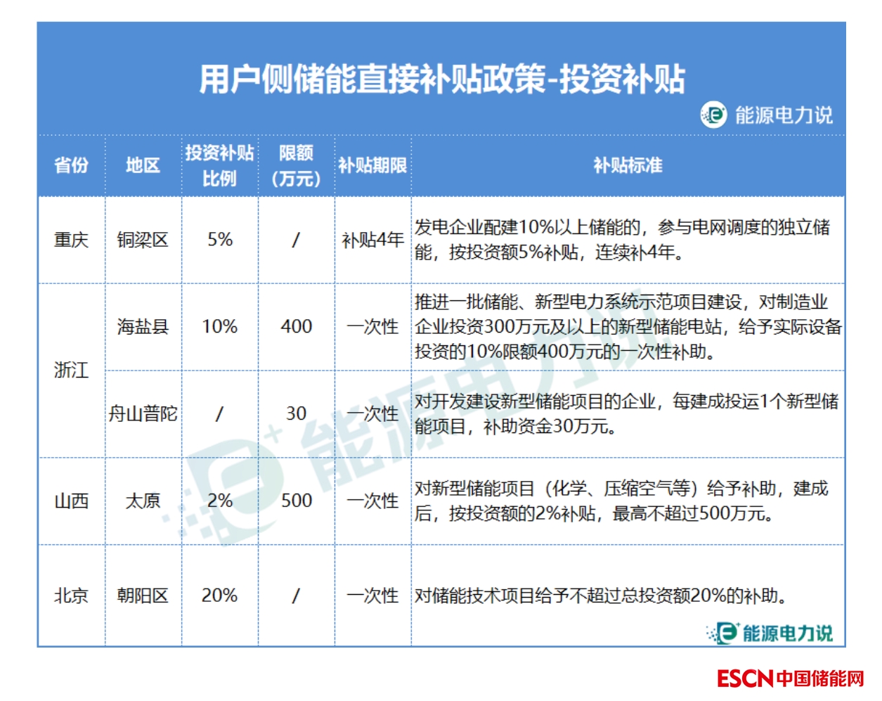 在投資補貼方面,重慶、浙江、山西、北京等多省地區(qū)出臺了儲能投資補貼政策,投資補貼比例在2%-20%之間,單個項目補貼限額在30-500萬元之間,補貼期限多為一次性補貼。其中浙江海鹽縣在《海鹽縣貫徹<浙江省推動經(jīng)濟高質(zhì)量發(fā)展若干政策>承接落實方案(征求意見稿)》提出,對對制造業(yè)企業(yè)投資300萬元及以上的新型儲能電站,給予實際設(shè)備投資的10%限額400萬元的一次性補助;重慶t銅梁區(qū)對參與電網(wǎng)調(diào)度的獨立儲能,按投資額5%補貼,連續(xù)補4年。