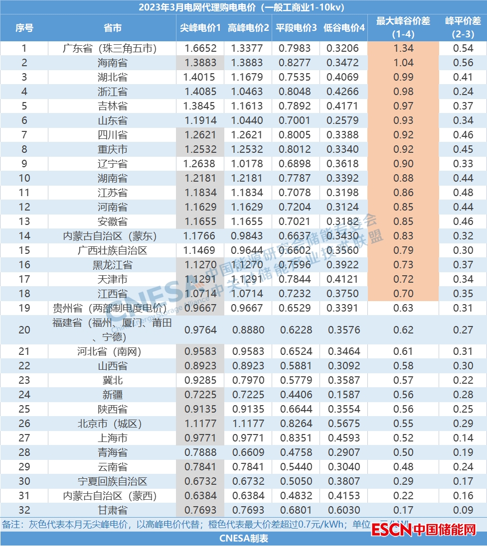 目前,大部分地區(qū)已公布2023年3月電網(wǎng)代購電價,CNESA對各地一般工商業(yè)10KV的單一制電價進行了匯總測算?,F(xiàn)有18個地區(qū)的最大峰谷價差超過0.7元/kWh,其中廣東?。ㄖ槿俏迨校┖秃D鲜〉淖畲蠓骞葍r差超過1元/kWh,價差變化較大的地區(qū)有海南省從2月的0.93元/kWh提高到1.04元/kWh;湖南省從1元/kWh降至0.88元/kWh;河北省南網(wǎng)從0.76元/kWh降至0.61元/kWh,其中,河北省南網(wǎng)3月不執(zhí)行尖峰電價。另外,甘肅省一直處于價差低位,本月0.17元/kWh創(chuàng)造電網(wǎng)代購電以來的最低價差,甘肅作為外送電大省,省內(nèi)電力電量平衡相對有保障,用電負荷較平穩(wěn)。