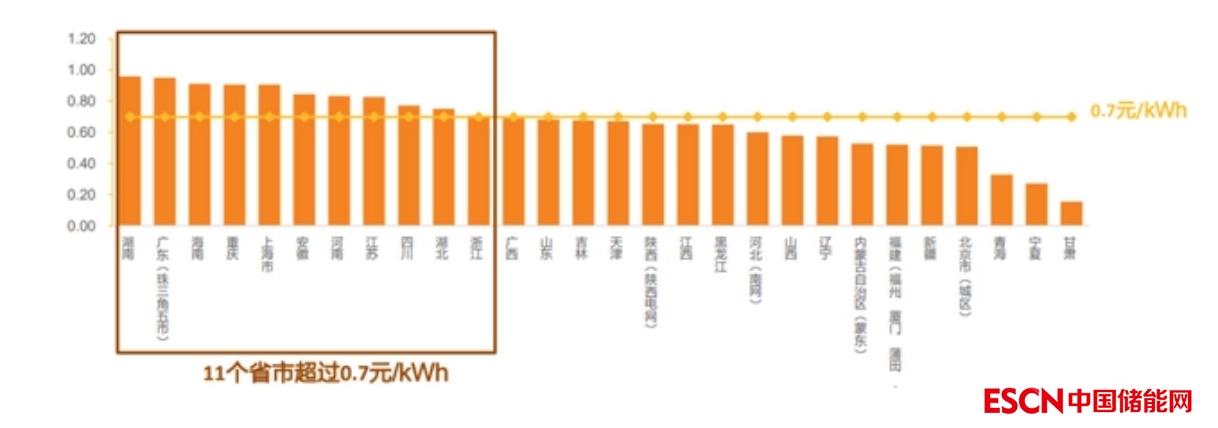 使用儲能劃不劃算,要看——LCOE(度電成本),這個(gè)判斷工商業(yè)儲能經(jīng)濟(jì)性的指標(biāo)。當(dāng)峰谷差價(jià)> 儲能LCOE時(shí),企業(yè)安裝儲能設(shè)備自然就可以節(jié)省用電成本。理想狀態(tài)下測算,每天一充一放下儲能LCOE≈0.63元/kwh,最新的數(shù)據(jù)顯示,已有11省的峰谷價(jià)差超過0.7元/kWh。