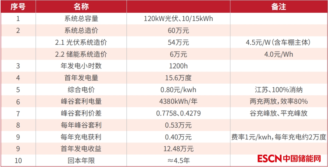 車棚120kW光伏、10/15kWh儲(chǔ)能整體測算:
