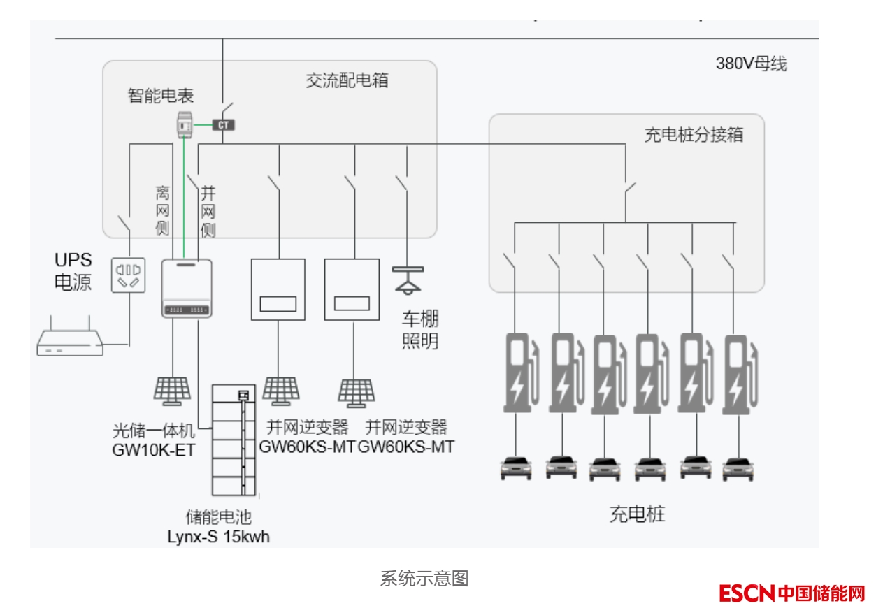 整個(gè)車棚包括120kW的光伏、10kW/15kWh的儲(chǔ)能示范及1個(gè)60kW直流充電樁、5個(gè)7kW交流充電樁,如下圖所示。