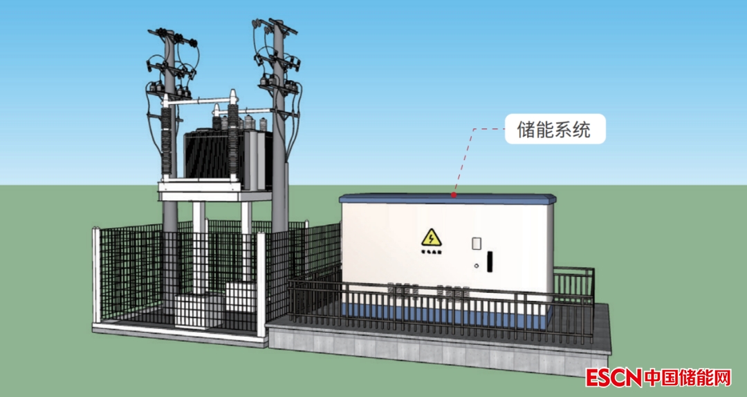 某村共120戶居民,其中分布式光伏安裝42戶,裝機(jī)容量約為500kWp,在村級變壓器側(cè)配置儲(chǔ)能系統(tǒng)單個(gè)單元50kW/90kWh,采用一體化模塊化設(shè)計(jì),布置在變壓器旁邊的空地上,如圖所示。