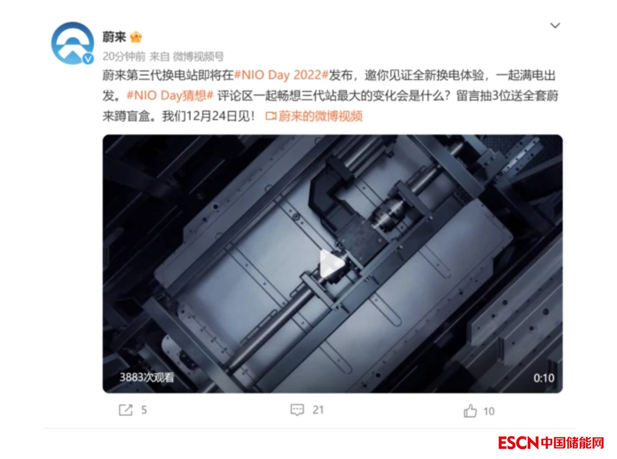 蔚來官宣第三代換電站12月24日發(fā)布