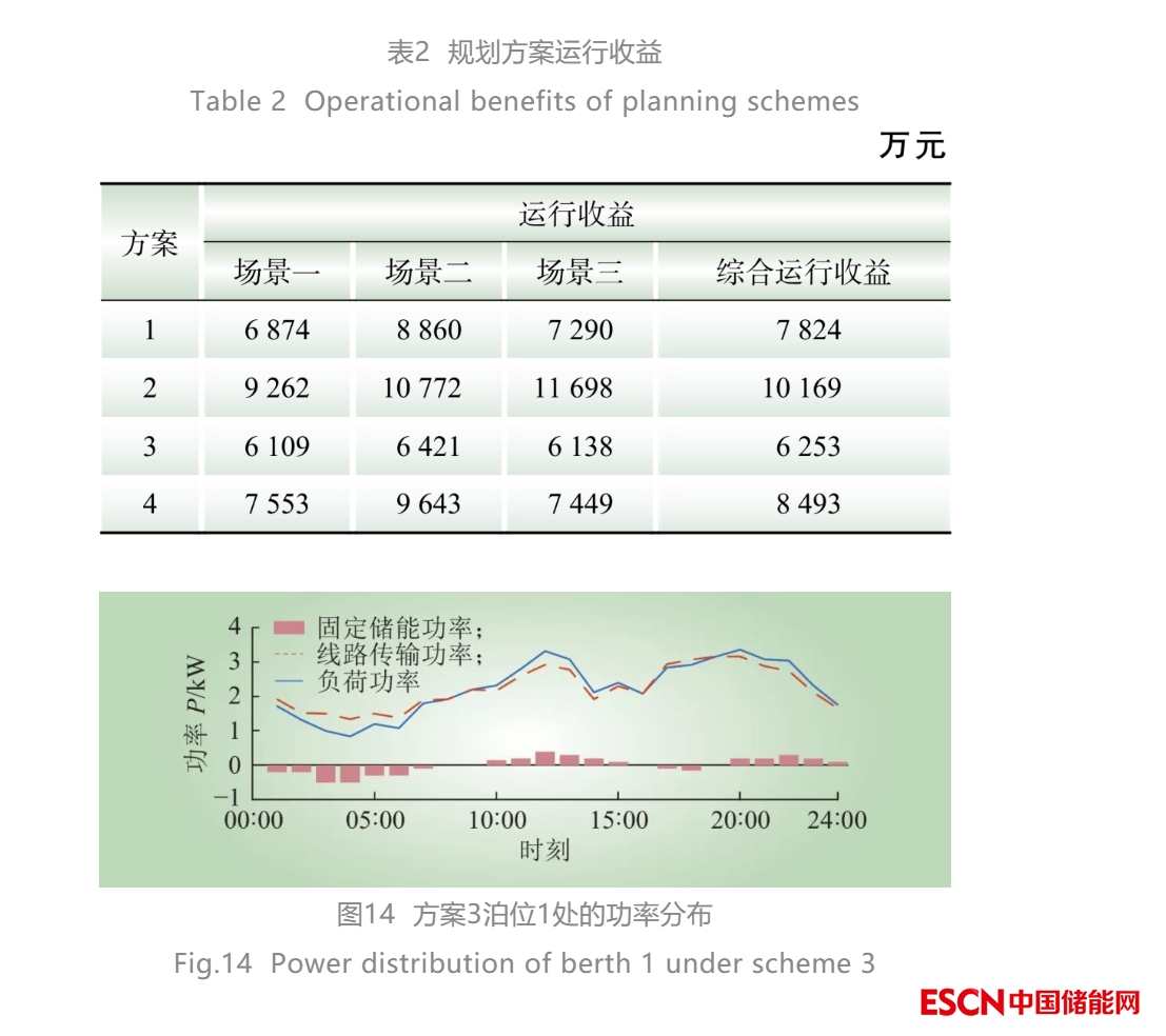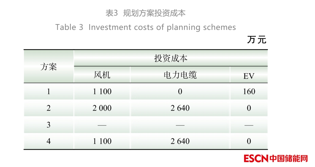 表3為規(guī)劃方案的投資成本。其中,算例結(jié)果表明,方案1在泊位2處新建風(fēng)機(jī)500 kW,泊位3處新建風(fēng)機(jī)600 kW;方案2在泊位2、3處新建風(fēng)機(jī)各1 MW;其中,方案2中海島由于存在穩(wěn)定的電力外送通道(海底電纜),風(fēng)機(jī)出力更容易被大電網(wǎng)消納,所以新建的風(fēng)機(jī)數(shù)目較方案1而言更多。需要說(shuō)明,由于儲(chǔ)能電池的運(yùn)行成本是通過(guò)電池的充放電次數(shù)和投資建造成本進(jìn)行核算,所以在此不再重復(fù)計(jì)算電池的投資成本。