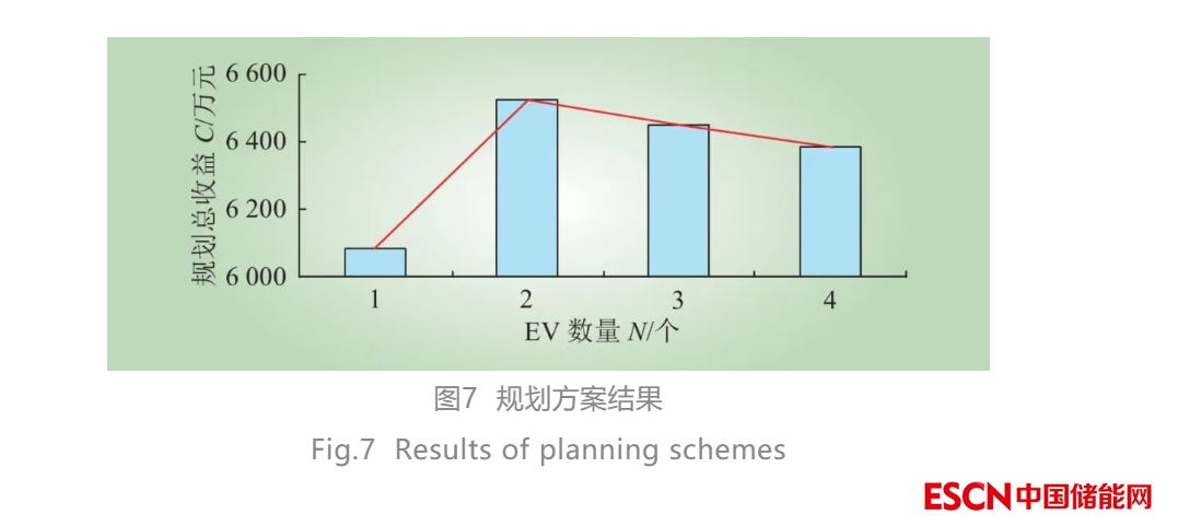第一階段求得的EV規(guī)劃數(shù)量為1。按照第二階段求解算法,比較EV數(shù)量 N∈{1,2,3,4} 時(shí)對(duì)應(yīng)的規(guī)劃總收益 F(N) 的大小,結(jié)果如圖7所示,可以看出,規(guī)劃期內(nèi)總收益 F(N) 隨著EV數(shù)量N的增大,先增大再減小,并在N=2時(shí)取得最大值,因此,規(guī)劃方案的最優(yōu)EV數(shù)量為2。