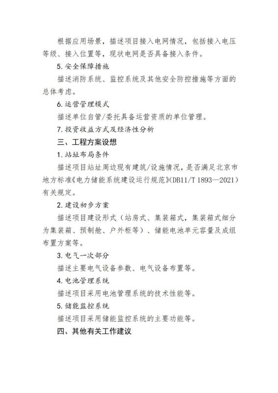 新型儲能項目應(yīng)結(jié)合電源側(cè)、電網(wǎng)側(cè)、用戶側(cè)多元化需求布局建設(shè),本次征集新型儲能項目應(yīng)符合國家標(biāo)準(zhǔn)、行業(yè)標(biāo)準(zhǔn)及北京市地方標(biāo)準(zhǔn)《電力儲能系統(tǒng)建設(shè)運行規(guī)范》(DB11/T 1893-2021)等相關(guān)要求,不得使用梯次利用動力電池。申報項目經(jīng)過評估,對符合條件的項目納入《北京市"十四五"新型儲能發(fā)展專項規(guī)劃》,作為項目建設(shè)支撐依據(jù)。