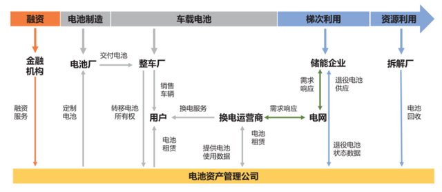 金融機構(gòu)提供融資方案;電池供應(yīng)商和整車廠、換電運營商之間通過定制和租/購?fù)瓿呻姵亟桓?,以及電池?shù)據(jù)交換完成統(tǒng)一管理,排除安全隱患;
