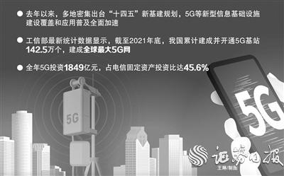 事實上,去年以來,多地密集出臺“十四五”新基建規(guī)劃,5G等新型信息基礎(chǔ)設(shè)施建設(shè)覆蓋和應(yīng)用普及全面加速。工信部最新統(tǒng)計數(shù)據(jù)顯示,截至2021年底,我國累計建成并開通5G基站142.5萬個,建成全球最大5G網(wǎng)。全年5G投資1849億元,占電信固定資產(chǎn)投資比達(dá)45.6%。