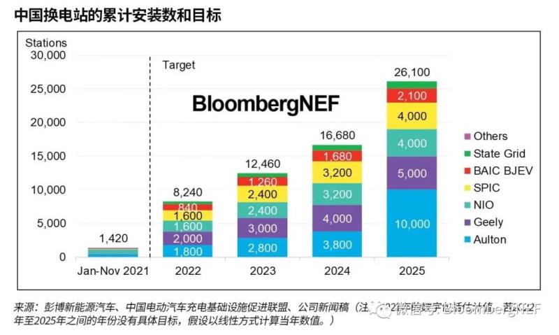 企業(yè)投資的上升可能也有助于推動(dòng)新建換電站。彭博新能源財(cái)經(jīng)統(tǒng)計(jì),共有六家中國(guó)公司計(jì)劃到2022年建設(shè)超過8,000座換電站,并到2025年建設(shè)26,000個(gè)站點(diǎn)。如果這些目標(biāo)得以實(shí)現(xiàn),換電站數(shù)量將遠(yuǎn)遠(yuǎn)超過政府的目標(biāo)。奧動(dòng)新能源是一家純換電運(yùn)營(yíng)商,提出了最為雄心勃勃的換電站建設(shè)目標(biāo),吉利汽車和蔚來緊隨其后。