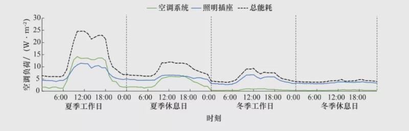 再選取典型日負(fù)荷曲線看,照明插座、動力用電和特殊用電受季節(jié)的影響較小,而空調(diào)用電負(fù)荷則有明顯的季節(jié)差異性。以政府辦公建筑類型為例(其典型日負(fù)荷曲線見圖1),其夏季空調(diào)用電量占比高達(dá)40%,而冬季不到10%。如果能夠充分挖掘空調(diào)系統(tǒng)的靈活性,一方面配置蓄冷、蓄冰、蓄電等儲能設(shè)施,另一方面結(jié)合建筑的用能需求和負(fù)荷特性優(yōu)化空調(diào)的運行調(diào)度策略,則有可能大幅降低夏季空調(diào)的負(fù)荷峰值。