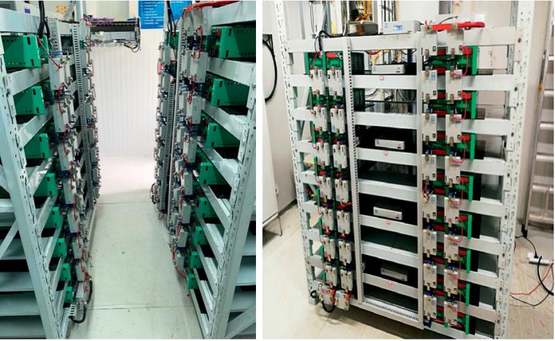 在構(gòu)成與電網(wǎng)互動的數(shù)字儲能系統(tǒng)中,以雙向互動試點為例,交流備電系統(tǒng)直流側(cè)工作電壓范圍為216~292 V(單體2.7~3.65 V),該電壓范圍與雙向儲能變流器的直流側(cè)電壓匹配(200~900 V)。直流備電系統(tǒng)直流側(cè)工作電壓范圍為43.2~58.4 V(單體2.7~3.65 V),通過AC/DC電源(AC 380 V/DC 48 V)對電池能量交換系統(tǒng)(含電池)進行充電和對基站核心直流負載進行供電,現(xiàn)場部署如圖6所示。