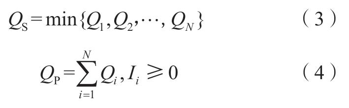 可重構(gòu)電池網(wǎng)絡(luò)模組能夠?qū)崿F(xiàn)基于電池單體層面的SOC精準估算,可以得出任意給定電池網(wǎng)絡(luò)拓撲的等效荷電容量模型。任意給定的電池網(wǎng)絡(luò)拓撲等效串/并聯(lián)原理示意如圖3所示。