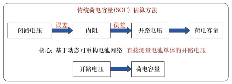 目前文獻中已經(jīng)有多種SOC估算方法,包括應(yīng)用最廣泛的安時積分法、開路電壓(open circuit voltage,OCV)與SOC映射法等,均依賴于電流或電壓的測量精度并受到電池非線性特性影響,其估算方法的精度受到質(zhì)疑。其中,SOC-OCV映射法是業(yè)界公認的最簡單、最精確的電池SOC估算方法,但是傳統(tǒng)固定串/并聯(lián)電池系統(tǒng)無法在電池系統(tǒng)充放電過程中動態(tài)實時測量電池單體的OCV,因此傳統(tǒng)固定拓撲連接的電池系統(tǒng)無法直接利用電池單體層面的OCV-SOC的一一對應(yīng)關(guān)系,只能通過測量工作電壓和電流推算電池內(nèi)阻,進而通過內(nèi)阻估算值進一步估算OCV,然后得到當前的SOC,過程中將引入兩次估算誤差傳遞,導(dǎo)致最終得到的結(jié)果誤差過大,嚴重影響了實際系統(tǒng)的用戶體驗和系統(tǒng)能量控制精度。圖2為基于重構(gòu)電池網(wǎng)絡(luò)SOC估計原理示意圖。