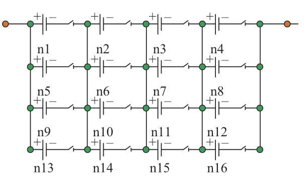 文獻[13]研究可重構(gòu)電池網(wǎng)絡(luò)理論,完成基于26650鋰離子電池單體樣機研制,該系統(tǒng)構(gòu)成4并4串的可重構(gòu)電池模組,其可重構(gòu)電池網(wǎng)絡(luò)的設(shè)計如圖1所示。電池儲能系統(tǒng)構(gòu)建12 V低壓直流數(shù)據(jù)中心不間斷供電系統(tǒng),結(jié)合圖論的優(yōu)化配置方法生成電池均衡管理與可重構(gòu)策略[26]。