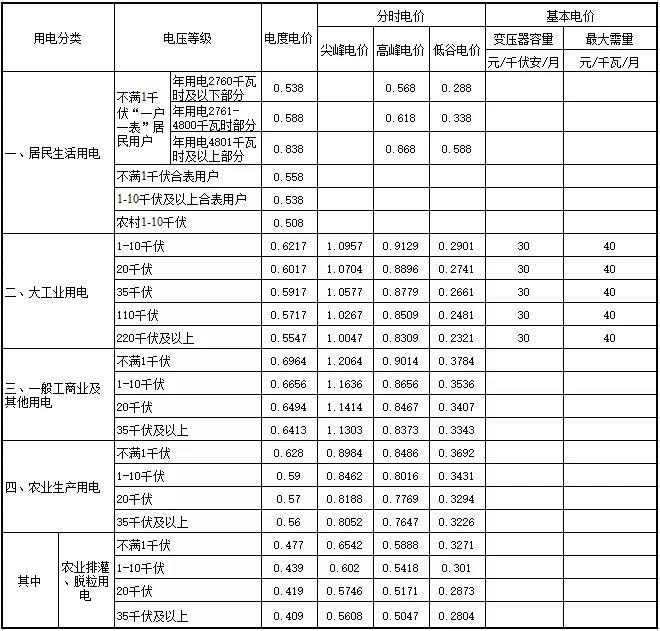 注:1.上表所列價(jià)格,均含國家重大水利工程建設(shè)基金0.403875分錢;除農(nóng)業(yè)生產(chǎn)用電以外,均含大中型水庫移民后期扶持資金0.62分錢;除農(nóng)業(yè)生產(chǎn)用電外,均含可再生能源電價(jià)附加,其中居民生活用電0.1分錢 、其余各類用電1.9分錢;核工業(yè)鈾擴(kuò)散廠和堆化工廠生產(chǎn)用電價(jià)格,按上表所列的分類電價(jià)降低1.7分錢執(zhí)行。