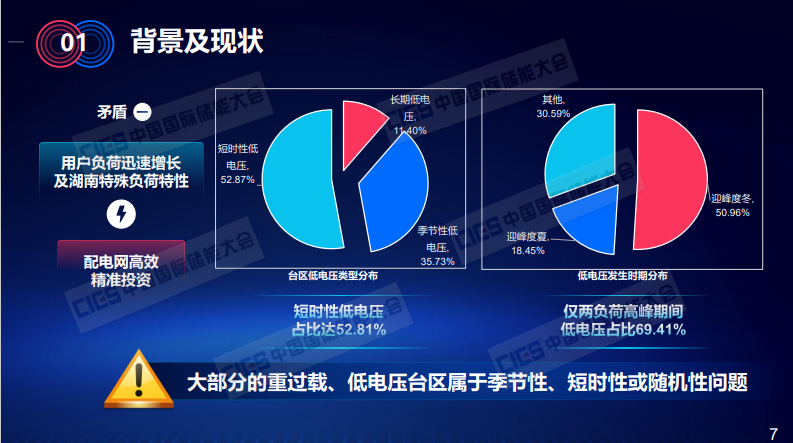 這是我們2020年對(duì)全省的配電變壓器過載現(xiàn)狀進(jìn)行的分析,我們發(fā)現(xiàn)有76%的配變過載集中在春節(jié)前后,而這些配變平均一年的重過載天數(shù)僅僅也只有7.75天,平均重過載時(shí)長(zhǎng)只有62.9個(gè)小時(shí)。因此,對(duì)于湖南來說,重過載與輕載并存的現(xiàn)象非常突出。此外,我們對(duì)低電壓臺(tái)區(qū)的情況也進(jìn)行了分析,發(fā)現(xiàn)短時(shí)性低電壓占比達(dá)52.81%,僅1月、2月和8月兩負(fù)荷高峰期間發(fā)生的低電壓占比就達(dá)到了69.41%。由此,我們可以得到結(jié)論,大部分的重過載低電壓臺(tái)區(qū)是屬于季節(jié)性、短時(shí)性或隨機(jī)性的問題。