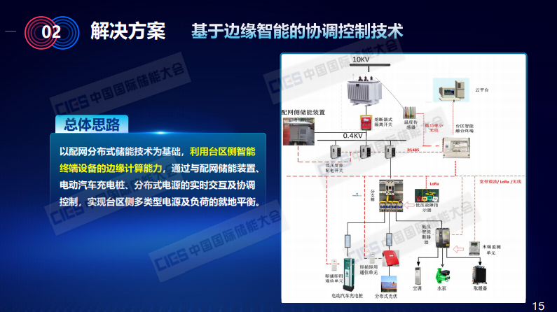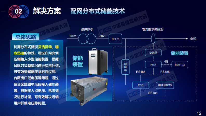 而儲(chǔ)能技術(shù)和物聯(lián)網(wǎng)技術(shù)的發(fā)展,為我們解決這兩個(gè)矛盾提出了一個(gè)新的思路,下面我們來介紹解決方案。第一,是我們剛才提到的配網(wǎng)側(cè)分布式儲(chǔ)能技術(shù)??傮w思路如下,它主要是利用分布式儲(chǔ)能靈活機(jī)動(dòng)、響應(yīng)迅速的特性,通過在配電臺(tái)區(qū)380V的主線并聯(lián)接入儲(chǔ)能裝置,通過實(shí)時(shí)監(jiān)控臺(tái)區(qū)以及用戶側(cè)的負(fù)荷、電流、電壓等相關(guān)的負(fù)荷數(shù)據(jù),在系統(tǒng)有需要的進(jìn)行實(shí)時(shí)就地的功率補(bǔ)充,以此解決相應(yīng)的重過載問題。解決低電壓的問題,一般來說用戶低電壓是出現(xiàn)在臺(tái)區(qū)的末端,也就是380V主線后端位置,在這種情況下,我們會(huì)將儲(chǔ)能裝置并聯(lián)接入末端集中低電壓用戶群前面一點(diǎn)點(diǎn)的位置,通過監(jiān)測(cè)接入點(diǎn)的電壓、電流等相關(guān)數(shù)據(jù),進(jìn)行就地補(bǔ)充,以此減少主線上因?yàn)榇筘?fù)荷電流所產(chǎn)生的壓降,以此來解決負(fù)荷側(cè)的低電壓?jiǎn)栴},這點(diǎn)對(duì)于山區(qū)用戶是非常有效的。