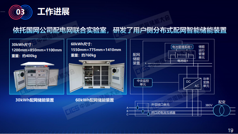 依托國(guó)網(wǎng)公司配電網(wǎng)聯(lián)合實(shí)驗(yàn)室,在2020年,我們開發(fā)了系列配網(wǎng)用戶側(cè)微儲(chǔ)能的樣機(jī),目前我們主要開發(fā)了30KWh和60KWh兩款樣機(jī)。整個(gè)裝置采用小型化和模塊化的設(shè)計(jì),由儲(chǔ)能電池單元、功率變換單元、中央監(jiān)控單元以及外輔設(shè)備構(gòu)成。通過將裝置并聯(lián)接入配電低壓側(cè)主線,實(shí)現(xiàn)對(duì)低電壓或過載臺(tái)區(qū)進(jìn)行功率補(bǔ)償。