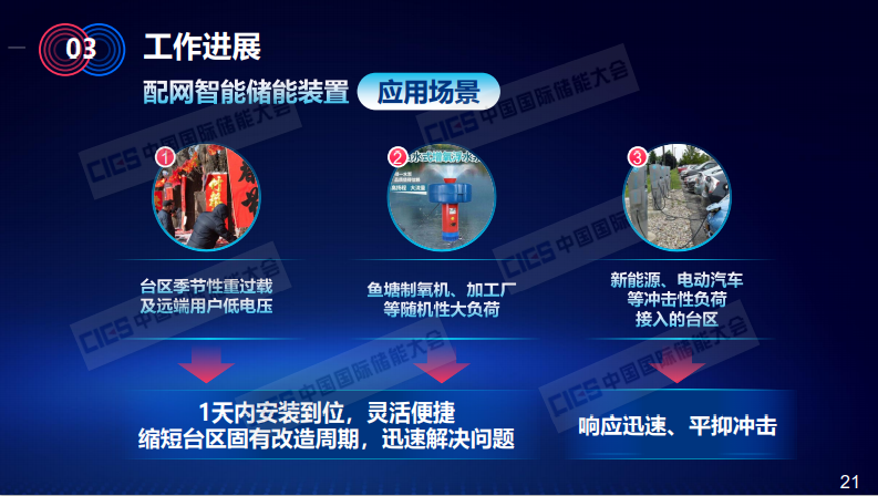 未來,當(dāng)我們裝置規(guī)?;瘧?yīng)用以后,可以在一定程度上補(bǔ)充電能缺口,還可以減少主網(wǎng)的投資,緩解線路的重過載問題。此外,儲(chǔ)能裝置還可以作為特殊時(shí)期的應(yīng)急保障電源,支撐局部線路,這是我們思考的一些額外裝置功能。在這里,這是目前儲(chǔ)能裝置涉及到的主要應(yīng)用領(lǐng)域,對(duì)于配網(wǎng)儲(chǔ)能裝置來說,非常適合應(yīng)用在季節(jié)性重過載以及遠(yuǎn)端用戶低電壓,還有魚塘制氧機(jī)、加工廠等隨機(jī)性大負(fù)荷所在區(qū)域,同時(shí)對(duì)新能源、電動(dòng)汽車等沖擊性負(fù)荷接入的臺(tái)區(qū),也可以迅速響應(yīng)。