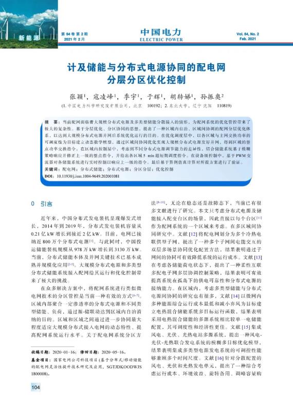 ZHANG Ying, KOU Lingfeng, JI Yu, et al. Hierarchical and partitioned optimal control of distribution networks considering the coordination between energy storage and distributed generation systems[J]. Electric Power, 2021, 54(2): 104-112.